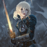 The image shows a stylized female character holding a sword. She has white hair and is wearing armor with some blood on it, suggesting that she may be in the midst of battle or a violent situation. The background has dark and moody elements, which might imply an intense or dramatic scene.