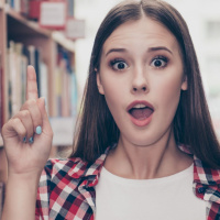 brunette hair and is wearing a checkered top with a high neckline. Her expression is one of surprise or shock, characterized by wide eyes and