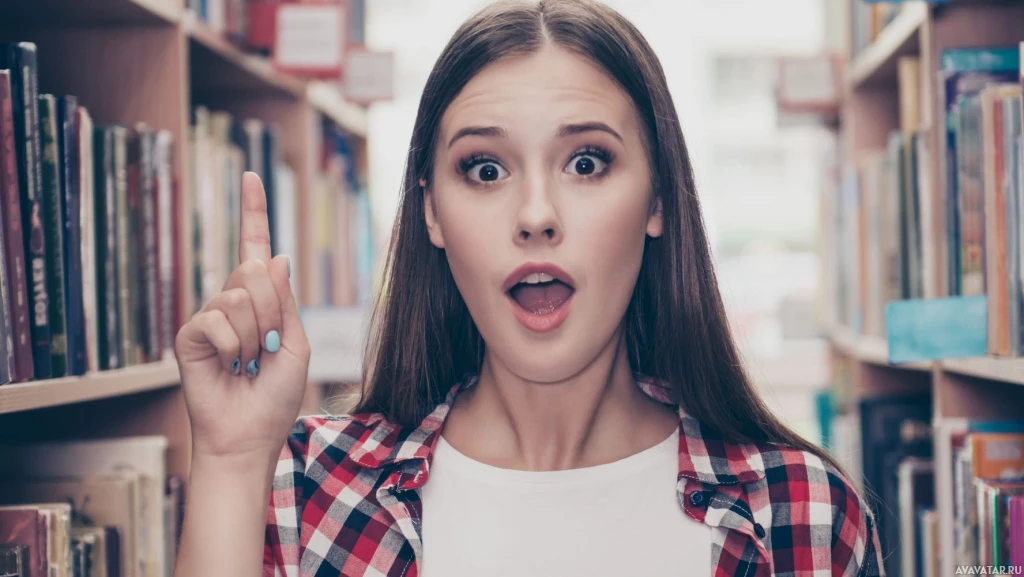The image shows a woman standing in what appears to be a library or bookstore. She is holding her hand out, as if gesturing towards the camera. She has