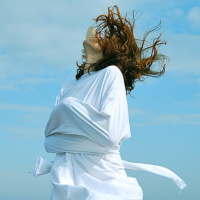 a blue sky with clouds. Her arms are raised and her head is turned towards the side, which may indicate that she's either dancing, walking quickly, or reacting to something out of frame.