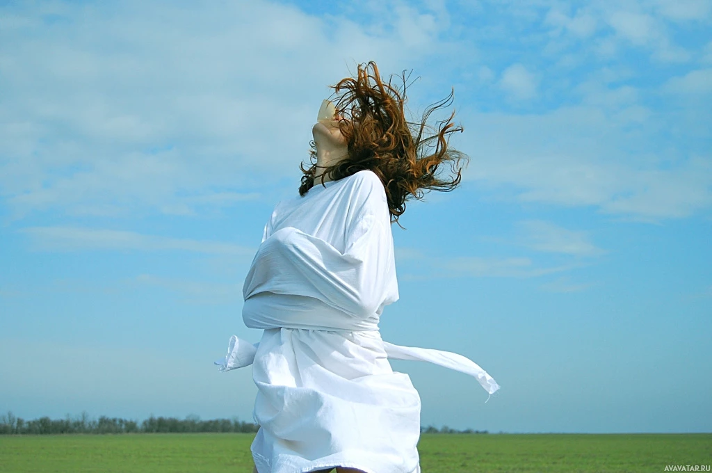 long hair and is wearing what seems to be a white dress or wrap around her waist. The background suggests an open field under