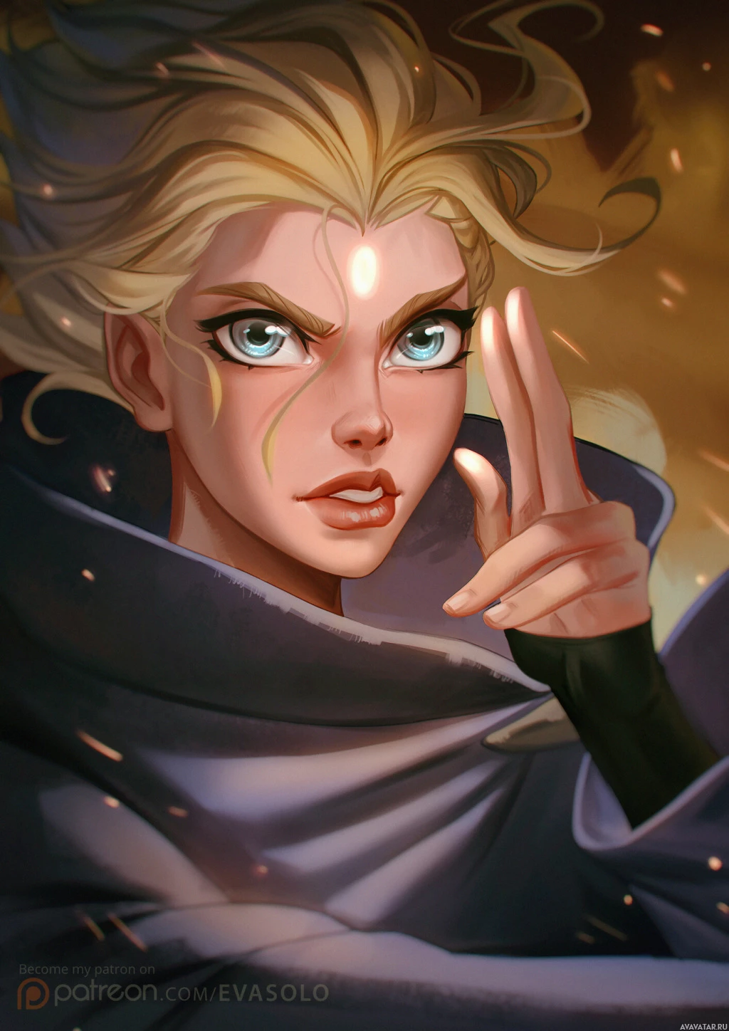a video game or comic book series. Her expression is intense, and she has her hand raised as if pointing or aiming at something. The background suggests a dramatic or intense scene, possibly indicating action or conflict.