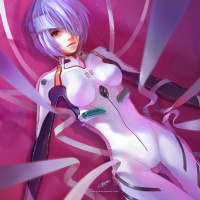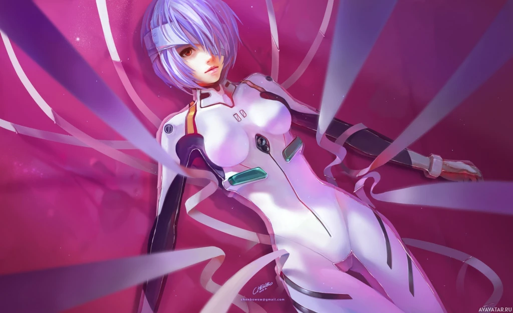 an animated character with purple hair. She is lying on a surface that appears to be floating, given the way her body is positioned against the backdrop of pink and white colors. The character is wearing some sort of armor or suit, suggesting she might be from