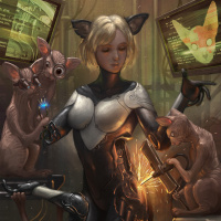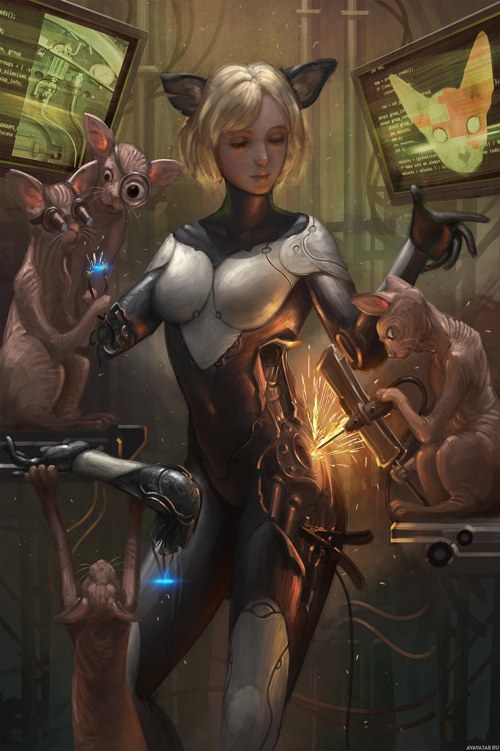 fiction setting, surrounded by various machines and equipment that suggest a high-tech environment. There are other creatures present as well, which appear to be mice or rats. The overall theme of the picture is blending elements of robotics with