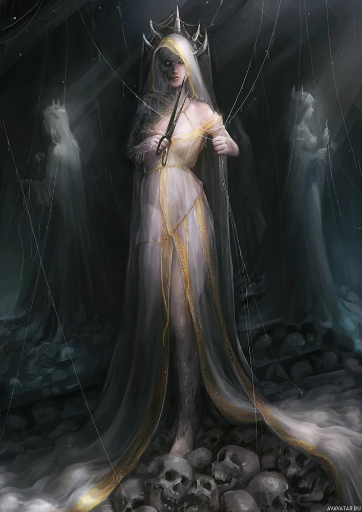 pale skin, pointed ears reminiscent of elves, and hair that cascades down in loose waves. She is holding scissors in one hand and appears to be standing among the skeletons or figures with hooded cloaks, which could suggest she has some