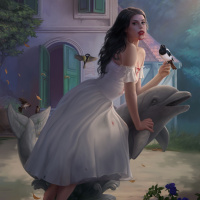 a brunette girl in an elegant white dress, sitting on the edge of what appears to be a garden fountain or statue. She is holding a bird in her hand. There are also other birds scattered around her. The setting seems whimsical and fantastical, possibly inspired by