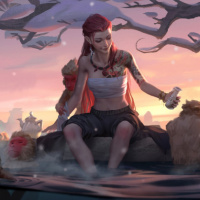 red hair who appears to be a young girl sitting on rocks in an outdoor setting. She has