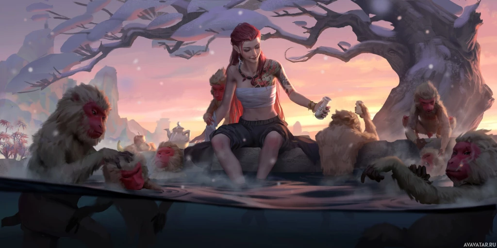 several monkeys around her; these animals have distinctive red faces and appear to be interacting or curious about the girl's presence. The environment suggests it could be a tropical area, possibly at sunset given