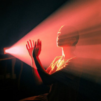 a young woman or girl, with her hands raised to her face as if she is in the midst of an intense emotion or experience. There is a red light effect around her hands and face, creating