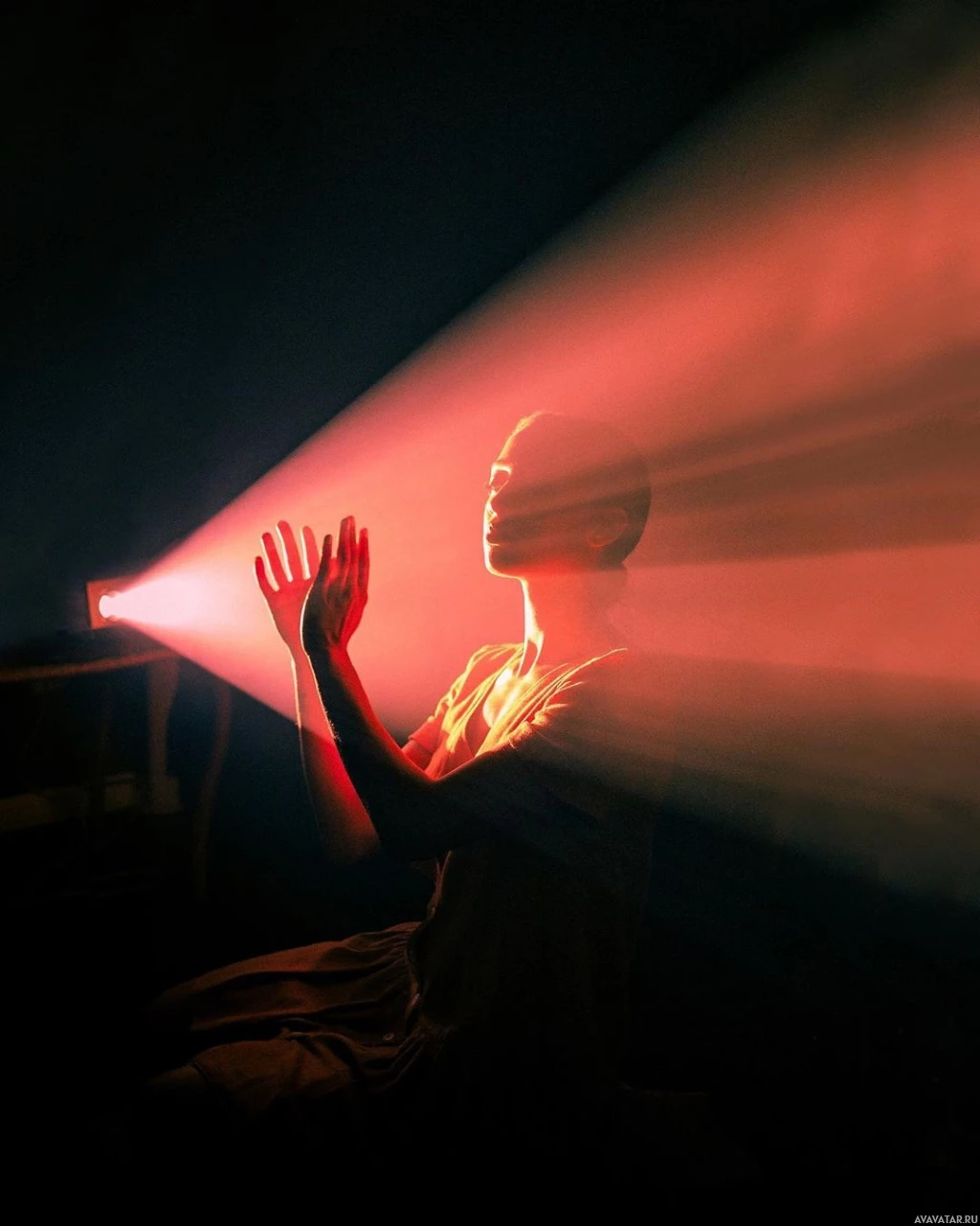 light source in front of her, giving the appearance that the light is emerging from or surrounding her. This could be an artistic representation meant to evoke feelings of passion, spirituality, or intensity.
