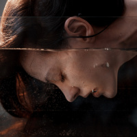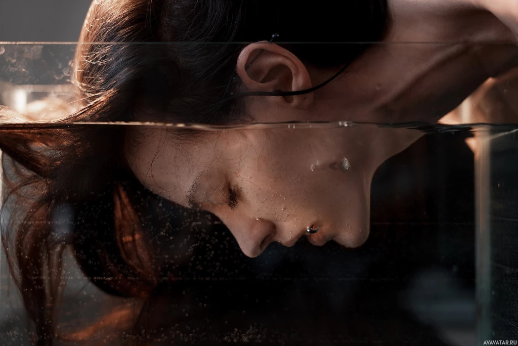 a young woman with long hair, and she has her eyes closed and mouth slightly open as if she is holding her breath or about to take a breath underwater. Her