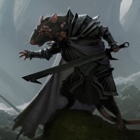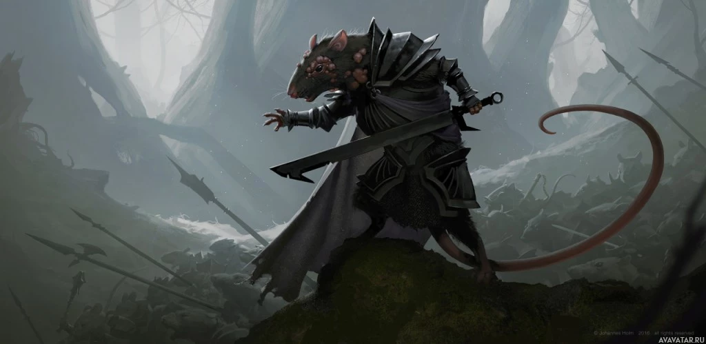 На картинке изображена сцена фэнтези с персонажем, который выглядит как крыса в человекоподобной форме, носит доспехи и держит меч. Постановка предполагает темную или таинственную лесную среду, возможно, указывающую на сценарий битвы или приключения. Общая тема довольно причудлива, смешивая элементы реализма (например, детализированные доспехи) с фантастическими существами.
