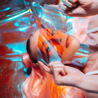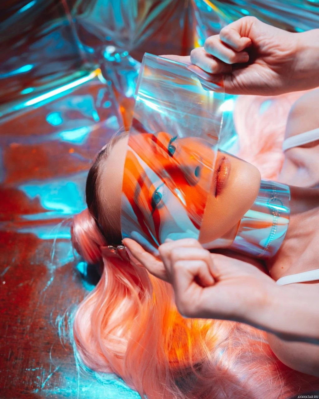 pink hair, lying on their back. They are holding what appears to be a piece of clear plastic or a similar reflective material over their face and part of their