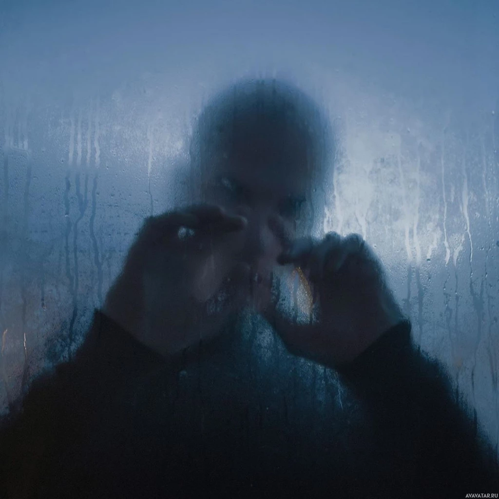 The image shows a person, who appears to be male and has shaved hair, looking through wet or frosted glass. His expression seems intense or focused. The background is out of focus, but it seems like the photo could have been taken during
