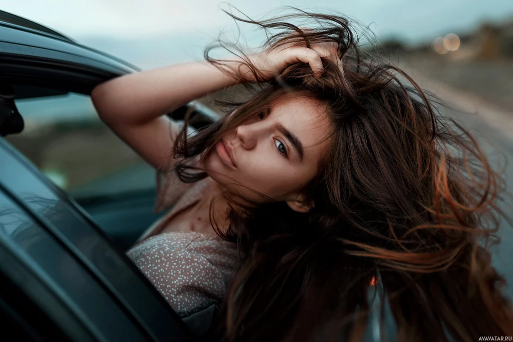 a young woman in the driver's seat of a car. She appears to be in motion as indicated by the wind blowing her hair. The girl is looking directly at the camera with