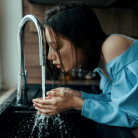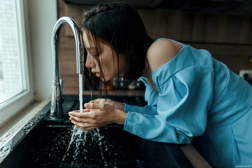 The image features a woman who appears to be washing her hands under running water. She has