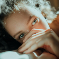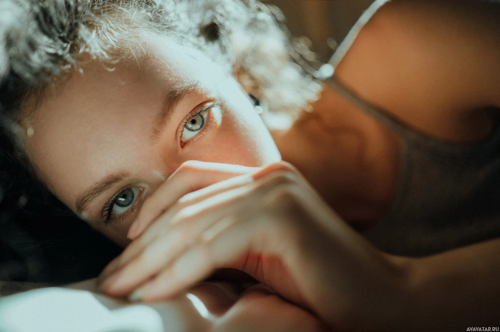 long hair and appear to be in a relaxed, possibly contemplative or sleepy state. Their eyes are closed, suggesting they might be in the process of falling asleep or just enjoying
