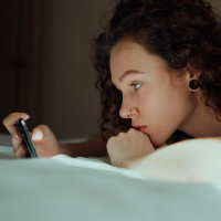 На картинке изображена молодая женщина, лежащая на животе на кровати. У нее темные волосы, в одном ухе серьга, а на руках видны татуировки. Она смотрит в свой телефон с выражением сосредоточенности или глубокой задумчивости.