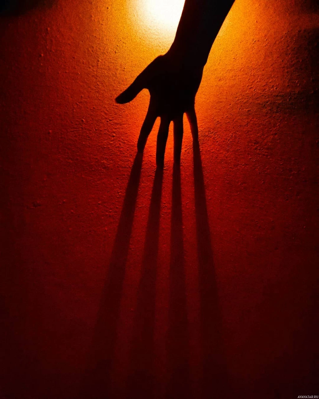 a shadow on a wall. The shadow appears to be that of another person's hand, which creates the illusion that there are two hands reaching towards each other. The background is dark, which helps highlight the contrast between the light from the hand and the shadow it casts.
