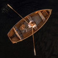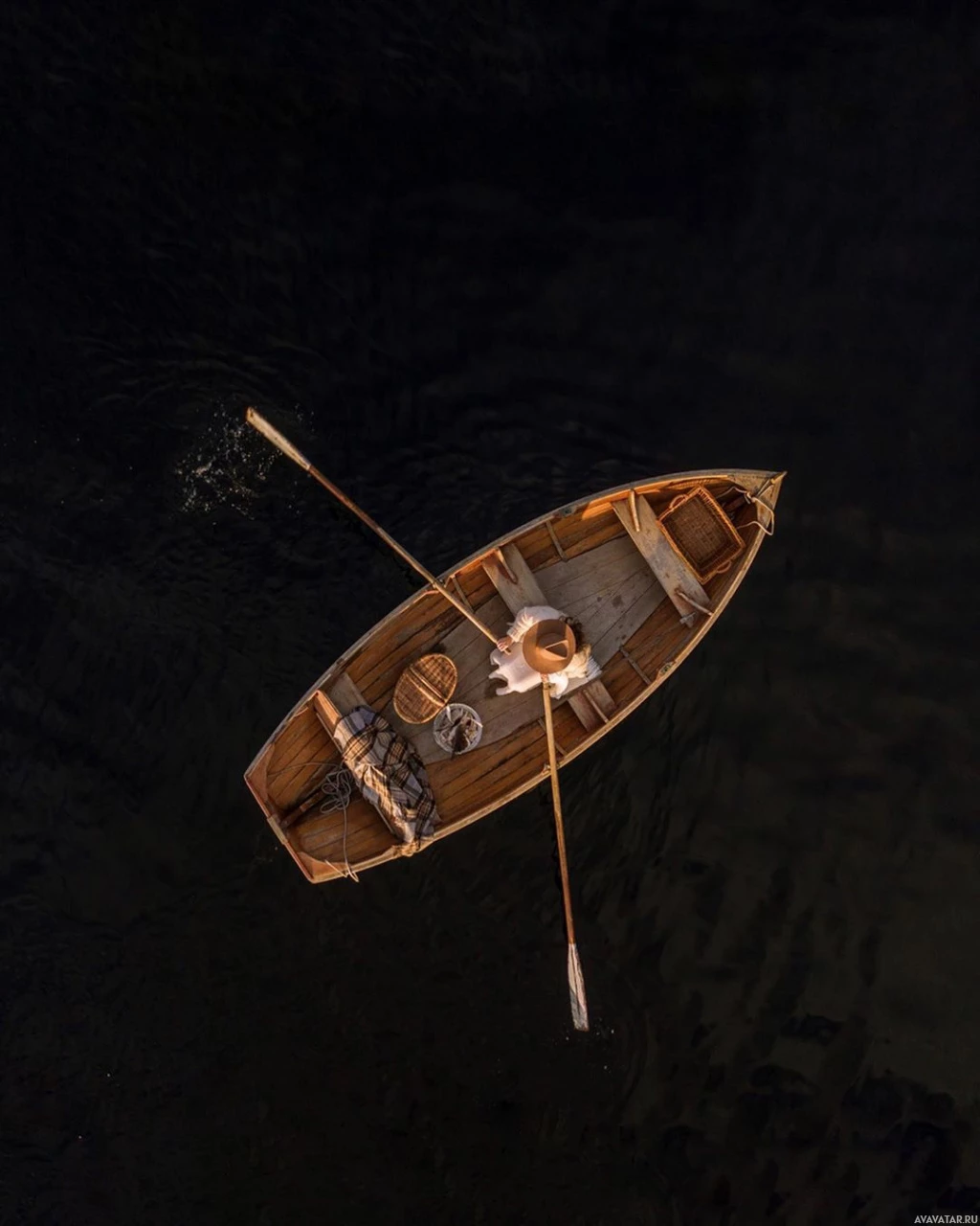 The image shows a person in a boat on