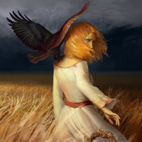 dark clouds, providing a dramatic backdrop for the figure. There's also a small crow perched on her hand, contributing to the overall sense of tranquility despite the impending weather change.