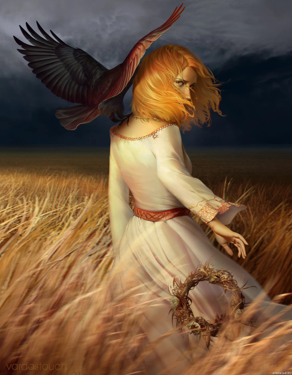 an open field with tall grasses around her. To her right, there's a bird perched on her shoulder, suggesting a connection between them, possibly symbolizing freedom or companionship. In front of her, there's