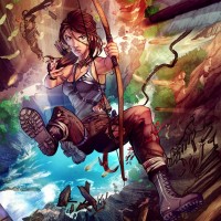 The image features a character who appears to be Lara Croft, known for her adventurous exploits. She is shown in an action pose holding a bow and arrow, suggesting she might be engaged in a game-
