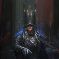 long hair and is wearing a cloak, adding to the regal or mystical nature of their appearance. In the background, there are other characters that could be soldiers or allies due to their armor and weapons. The setting appears to be indoors with stone walls and torches, which may indicate a dungeon or battlefield scene from