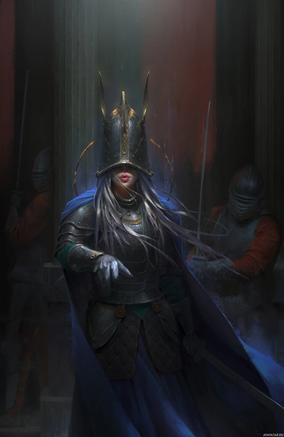 The image features a fantasy-themed character who appears to be a warrior, standing confidently amidst other figures. This individual is adorned with armor and a helmet that suggests a historical or medieval influence. There's also a sword held by this figure, which contributes to the depiction of