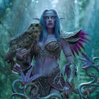 blue eyes. Their hair is styled in a way that complements their unique features, and they are holding an owl perched on one hand while the other hand holds what appears to be