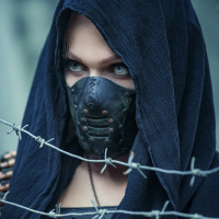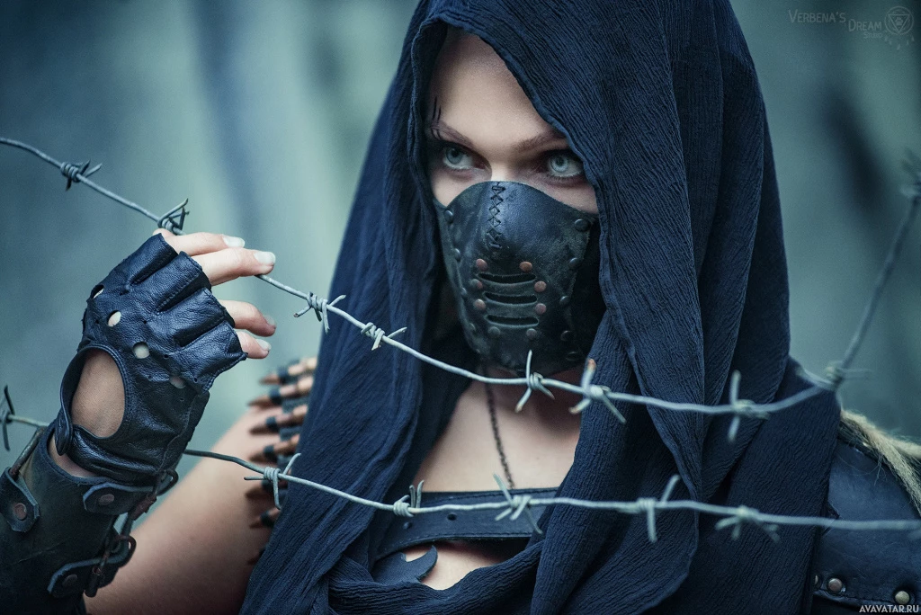 The image shows a person dressed in an armored or costumed outfit, which appears to be inspired by fantasy or role-playing game elements. The individual has a hood covering their head and is wearing what looks like