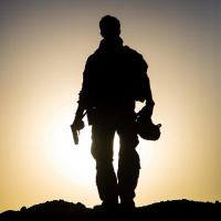 На картинке изображен силуэт человека, стоящего спиной к зрителю и любующегося закатом. Кажется, что этот человек держит в одной руке предмет, похожий на пистолет. На нем надето что-то похожее на военную форму.