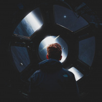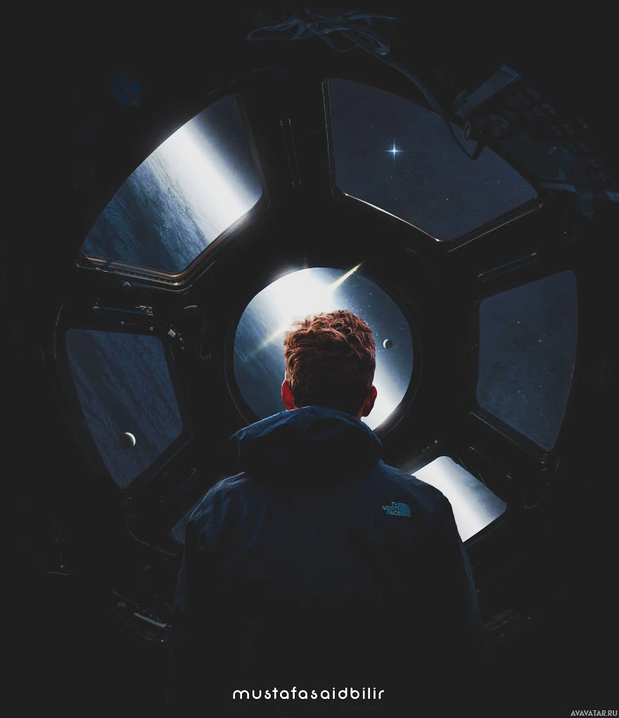 The image depicts a person in a space-themed environment. They are wearing