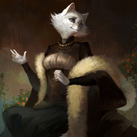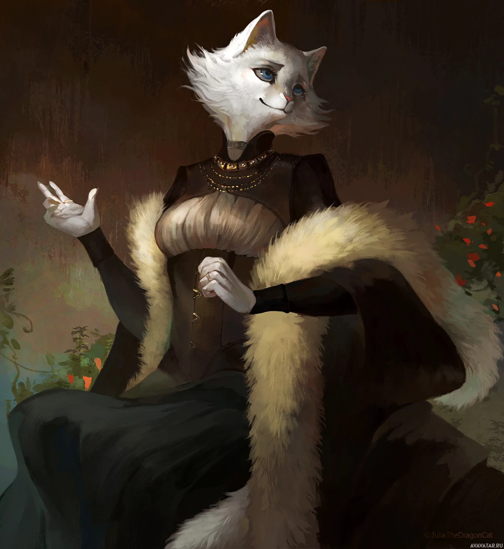 cat character wearing a long, flowing dress with fur trim and holding what appears to be a magical wand. The cat has human-like features, such as hands that are capable of grasping the wand. It is sitting on