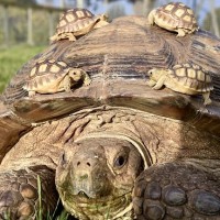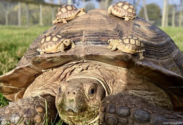 The picture shows a tortoise with four young ones on its back. This is an image of an animal, specifically a tortoise, which can be identified by their hard shell and the presence of hatchlings on top of it.