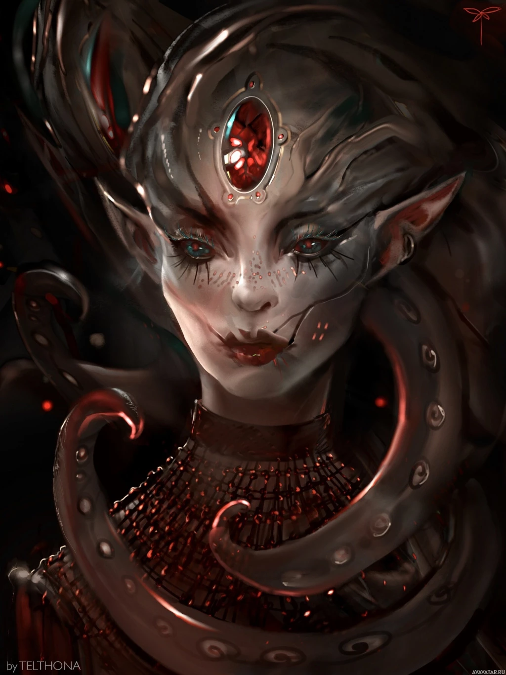 a fantasy character with an octopus head and humanoid features. This creature has long, flowing tentacles around its face and neck, giving it a striking appearance that blends elements of