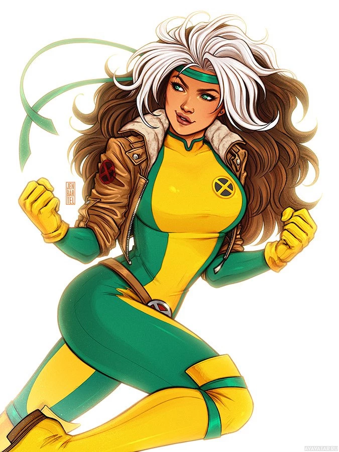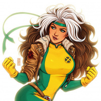 a female character who appears to be inspired by the X-Men, specifically resembling the mutant Rogue. She is depicted with shoulder-length gray hair, and her costume consists of