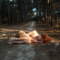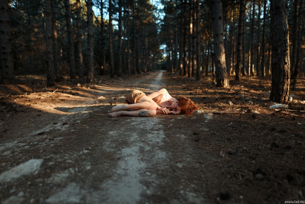red hair and is wearing minimal clothing. They are surrounded by a forest setting with trees and