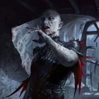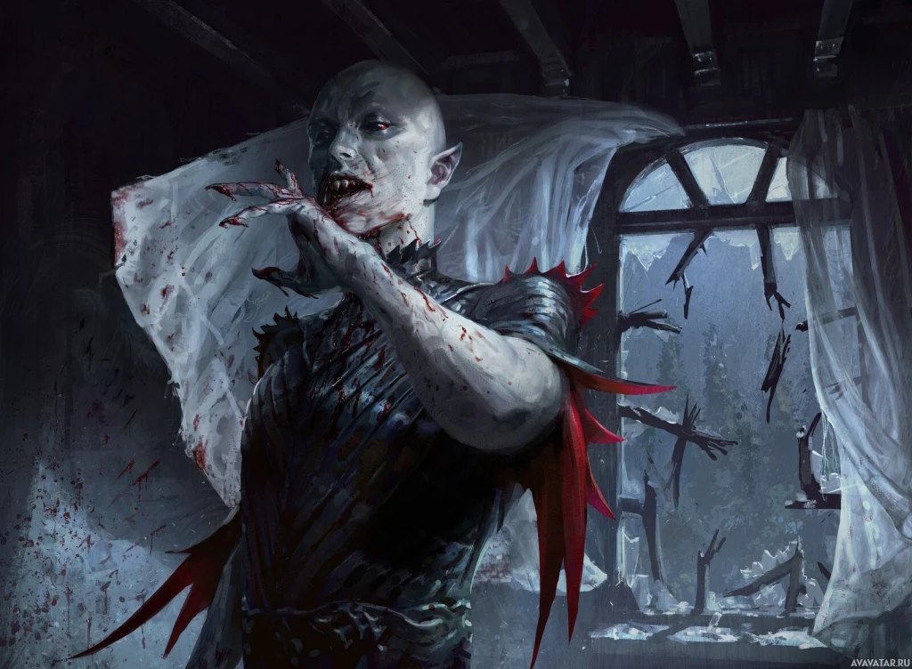 a horror scene featuring what appears to be a vampire or undead creature. The character is shown with pale, bloodless skin,