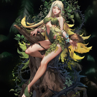 a fantasy character styled as a dryad, which is a type of tree nymph from Greek mythology. The dryad has an ethereal and seductive appearance, with