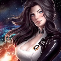 The image depicts an illustrated character that appears to be Miranda Lawson from the "Mass Effect"