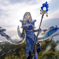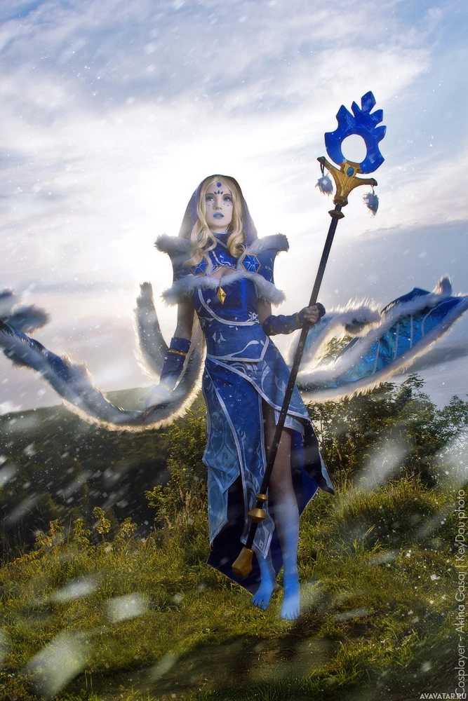 The image depicts a person dressed in cosplay, portraying the character of Crystal Maiden from