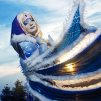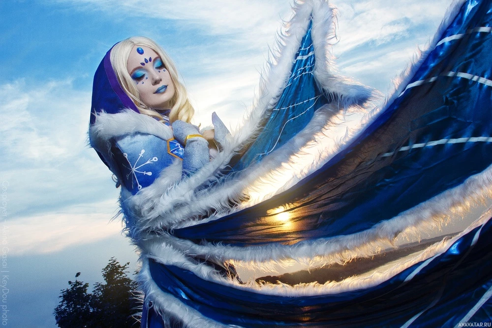 The image shows a person dressed in an elaborate costume, which is a representation of the character