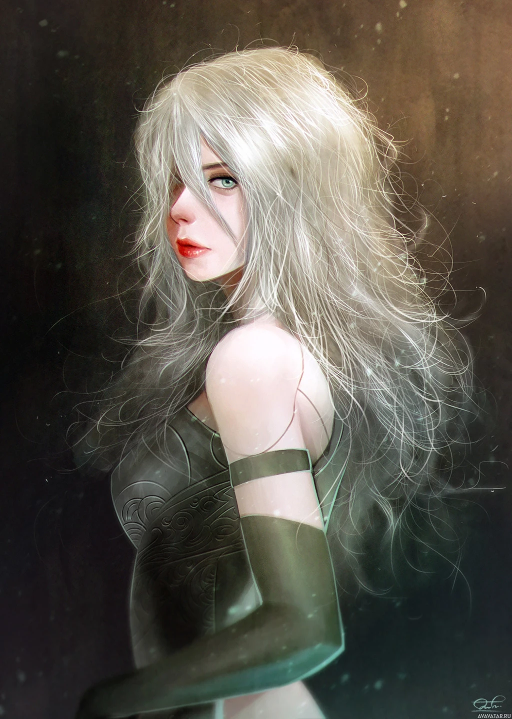 an indoor setting with dim lighting, possibly indicating a mood of solitude or introspection. The artwork showcases intricate details in the hair and attire, suggesting a focus on realism within