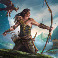На картинке изображена фантастическая сцена с участием эльфа-лучника. Эльф одет в доспехи и держит лук в одной руке, а другая направлена вперед, как будто целится во что-то или в кого-то вне кадра. На заднем плане изображены величественные горы и облака, что наводит на мысль о расположении на большой высоте, что придает сцене мистическую атмосферу.