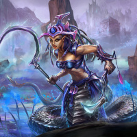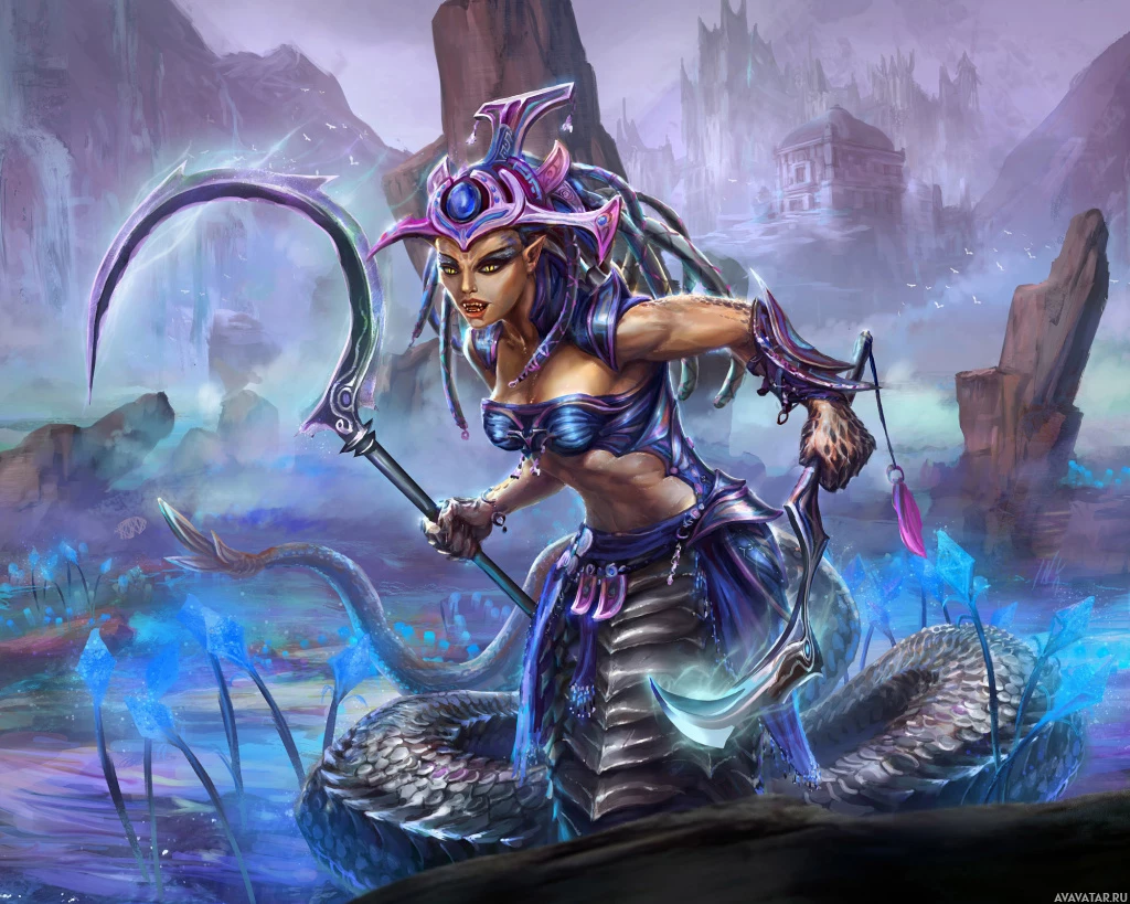 a fantasy scene featuring a character that is a naga, which is a mythical creature typically represented as a serpent with human-like upper body. This naga has purple and pink scales, and it's wearing armor or clothing that gives it a mystical appearance. The background suggests a magical or enchanted environment with misty terrain and what seems to be