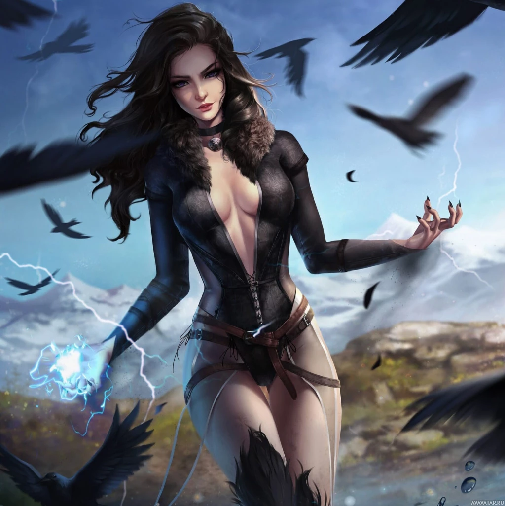 a black outfit with fur details and appears to be wielding magic, as indicated by the blue energy emanating from her hand. There are several birds flying around her, adding to