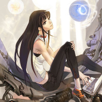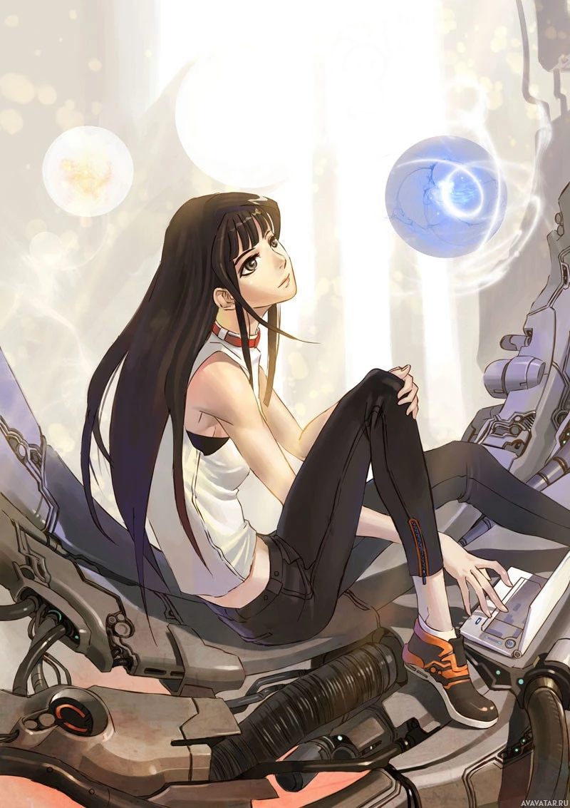 a science fiction setting, surrounded by mechanical structures and machinery that suggests a futuristic or advanced environment. There are also floating orbs near her which could be indicative of the technology or energy present in this scene. The character seems to be contemplating something as she looks off to the side with