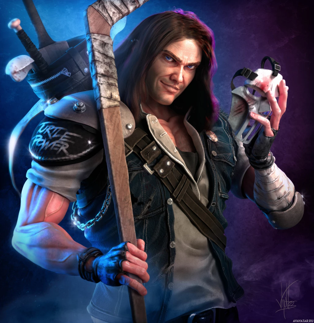 Casey Jones, a character from the series. He is holding what looks like a skull and