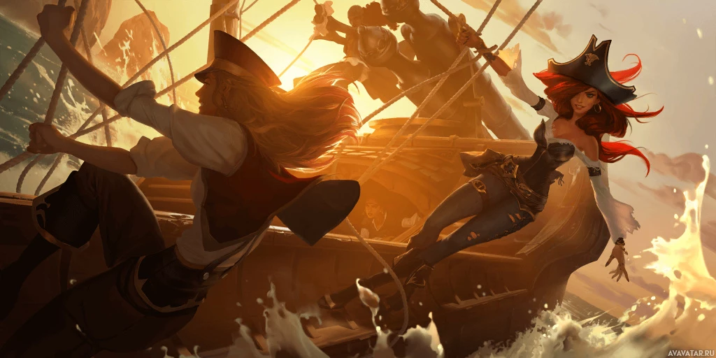 a female character with red hair, wearing a pirate outfit and holding what appears to be a flintlock pistol. To her right is another character, also wearing